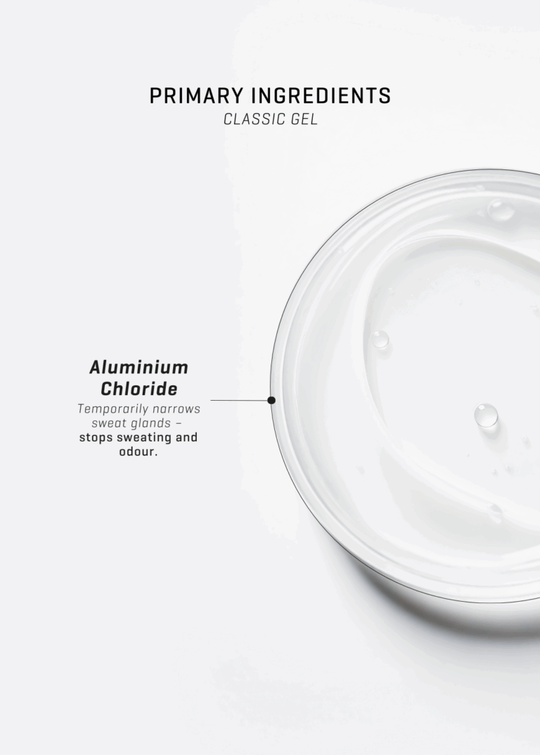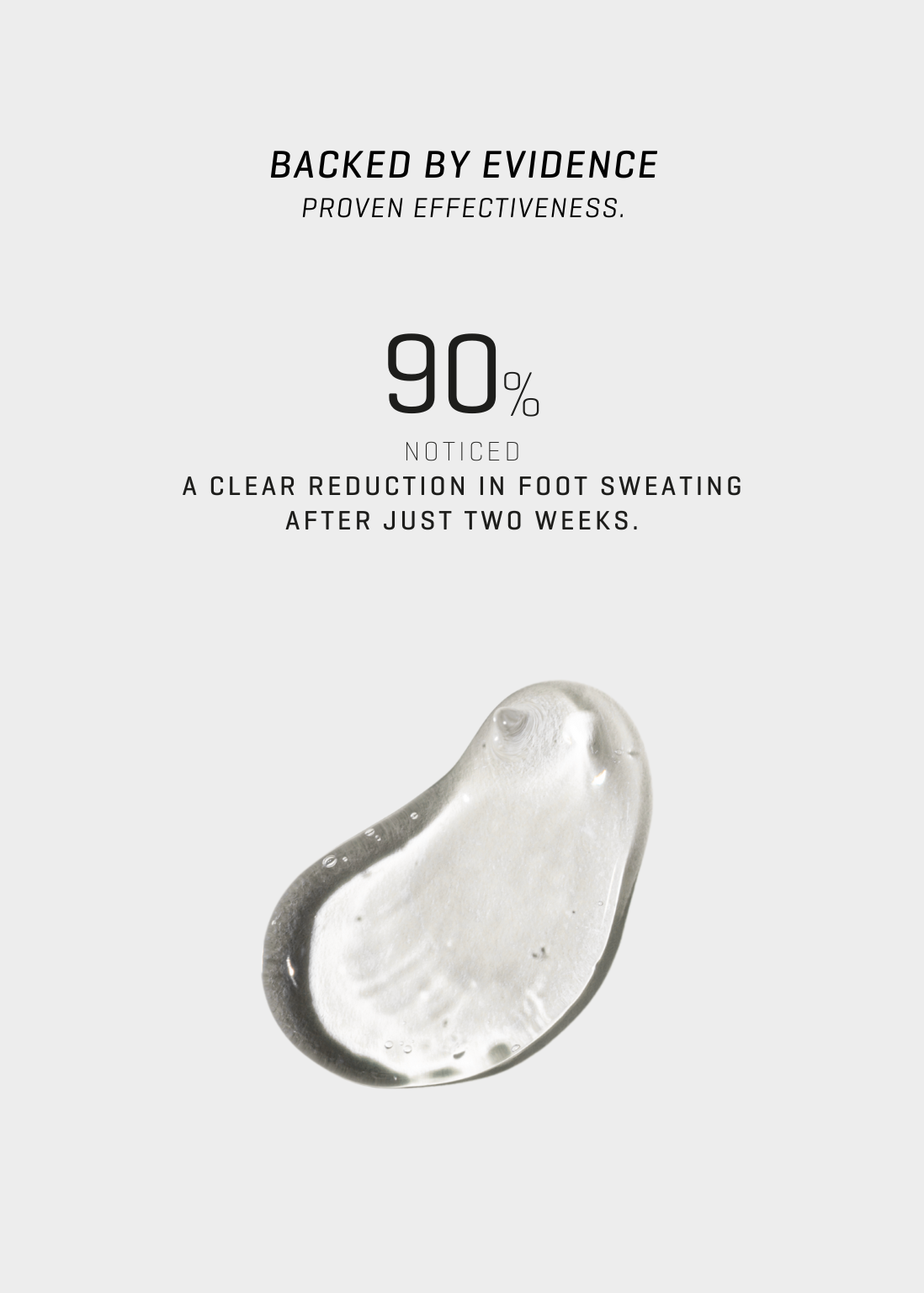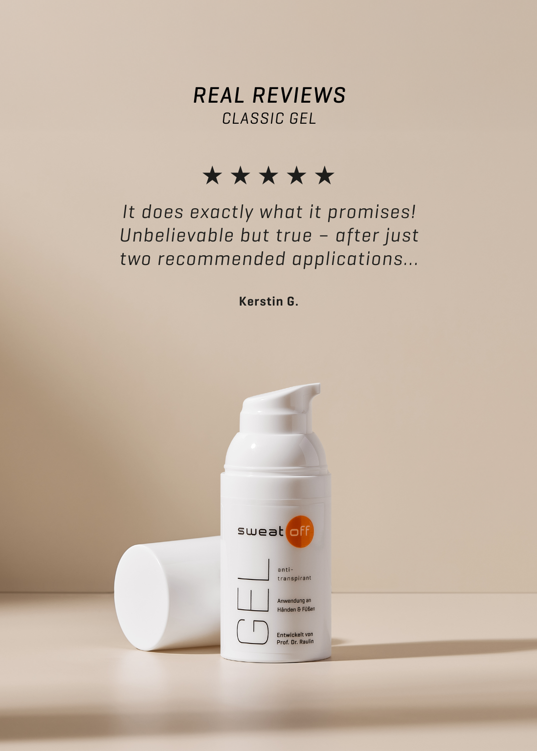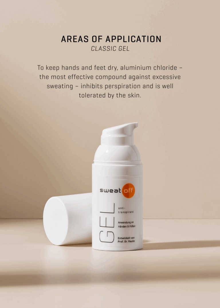 Our Sweat-Off Gel was developed to stop sweat and odour on hands and feet in the long term. It is based on aluminium chloride, the most effective, non-invasive active ingredient in dermatology against sweating. It offers long-lasting protection by locally preventing the escape of sweat and at the same time has been proven to be very well tolerated by the skin.