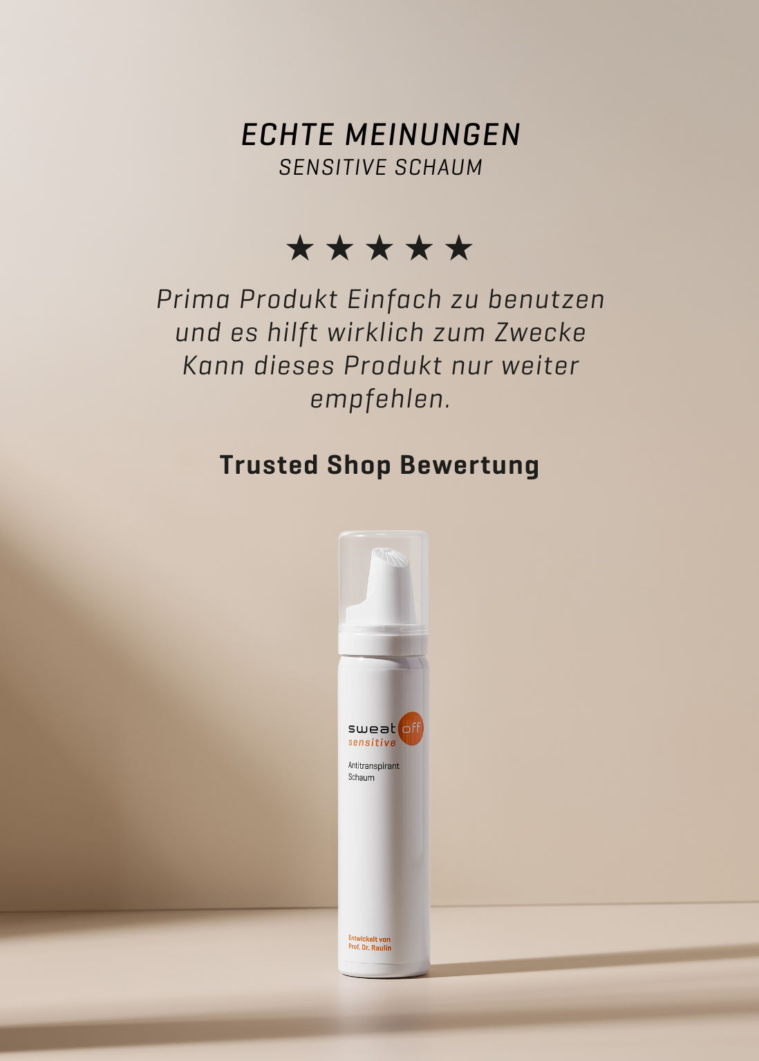 In unabhängigen Untersuchungen konnte nachgewiesen werden, dass der Sweat-Off Schaum Schweiß effektiv reduziert. Die hohe Wirksamkeit basiert auf Aluminiumlaktat, einem innovativen Wirkstoff der Schweißbehandlung. Gleichzeitig ist der Schaum nachweislich sehr gut verträglich. Durch die Kombination mit hautschützendem Salbei-Extrakt und hautbarrierestärkendem Arginin ist er für die dauerhafte Anwendung in sensiblen Hautarealen bestens geeignet.