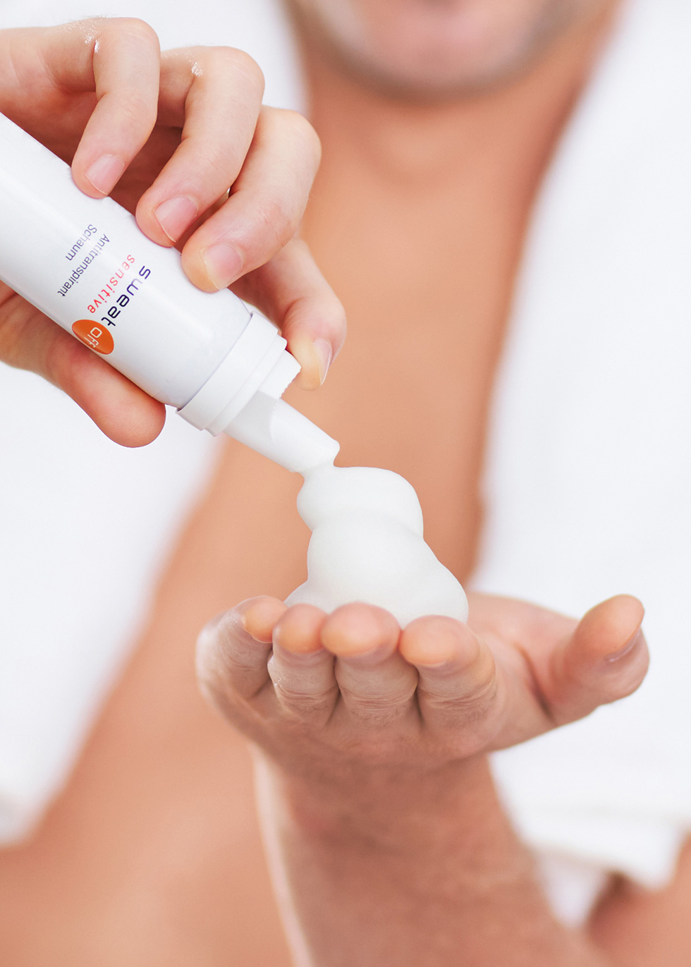Die beste Lösung gegen Schweiß an Rücken, Brust, Bauch und Gesäß: Unser Schaum. Seine einzigartige Konsistenz erlaubt es ihn auf größeren Körperflächen leicht zu verteilen und da er schnell einzieht, kommt es zu keiner Filmbildung.